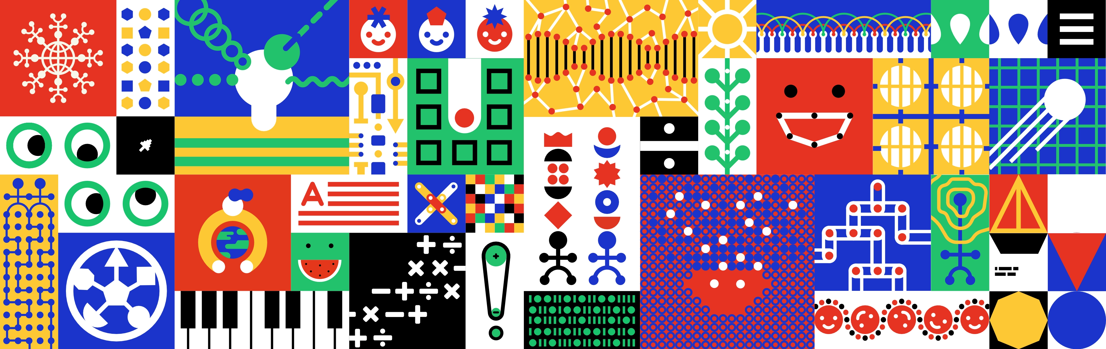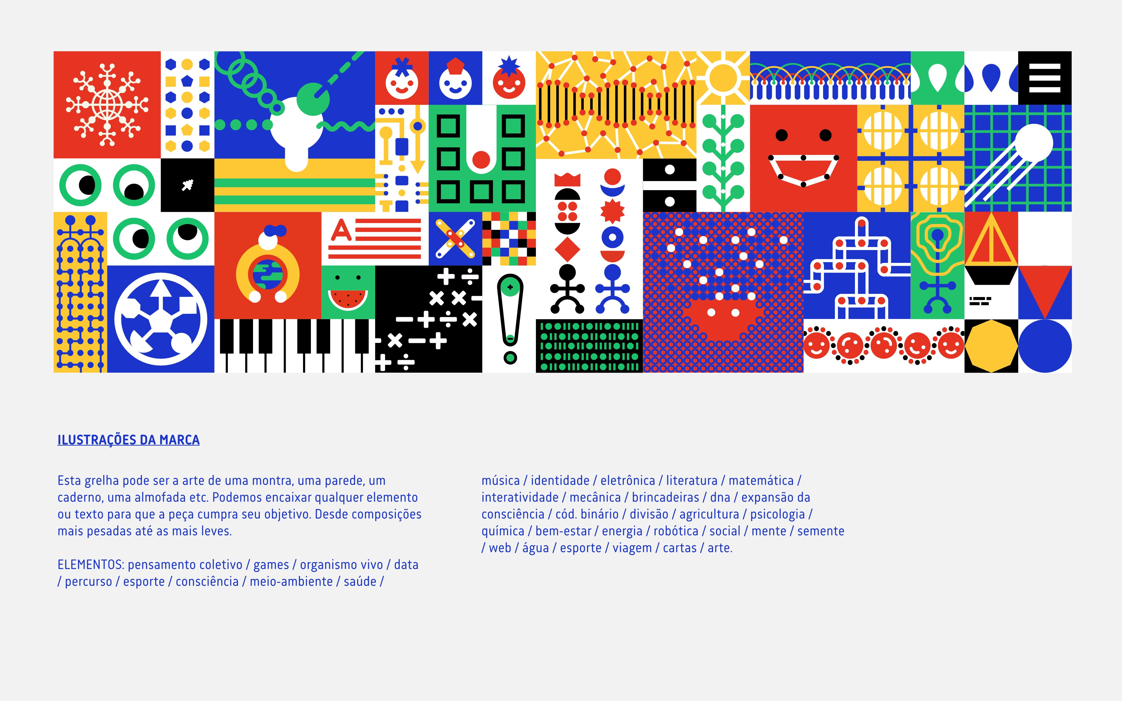 A modular wordmark where icons replace letterforms depending on context — six icon sets representing different disciplines: health, robotics, mathematics, music, mechanics, and binary code. The logo doesn't repeat itself; it reconfigures. The identity guide was written not as a rulebook but as a framework for invention.