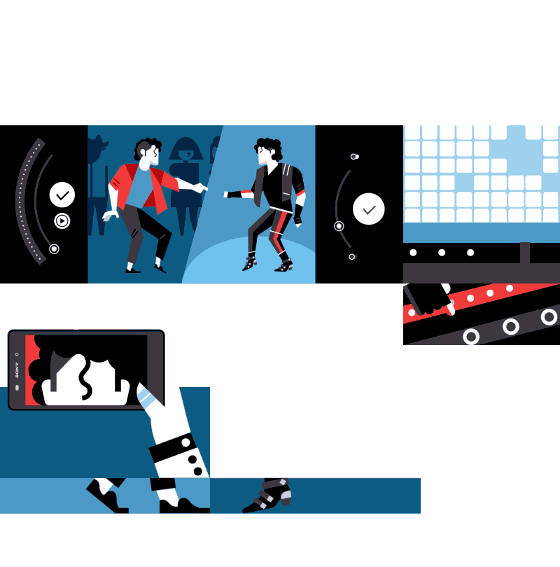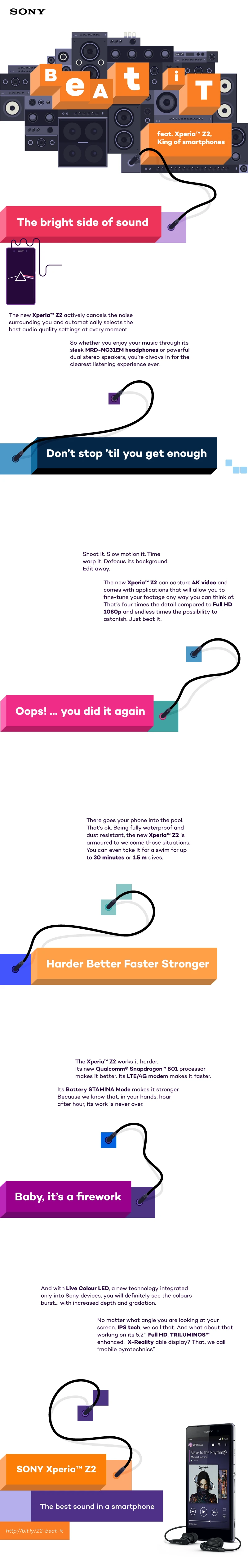 Building on the visual language established in the Z Ultra campaign, "Beat It" pushed the compositions further—more intricate layouts, richer animations, and a music-driven concept that played to the Z2's standout audio features like digital noise cancellation, Hi-Res Audio, and stereo front speakers.