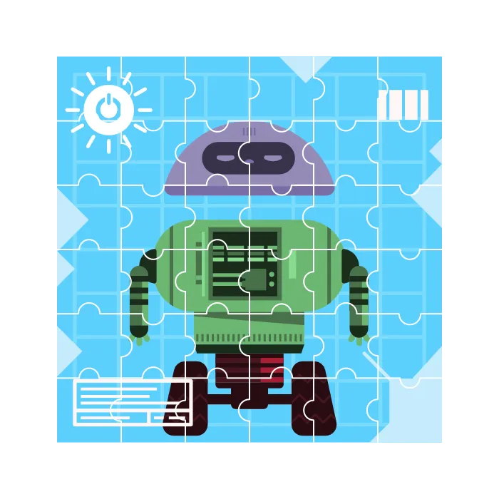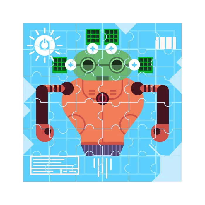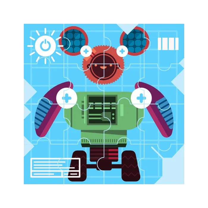 Players assemble robots from scattered parts, matching components to complete each design—building spatial awareness and an understanding of how parts form a whole.