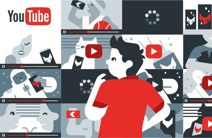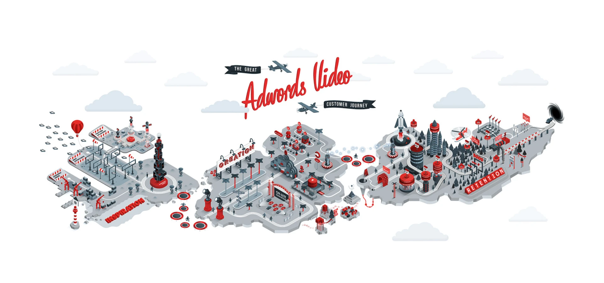 Commissioned through Rehabstudio for YouTube's new California office, the mural visualises the advertising customer journey as three interconnected islands—Inspiration, Creation, and Retention—each packed with scenes and details that represent different facets of the YouTube ecosystem and the people who use it.